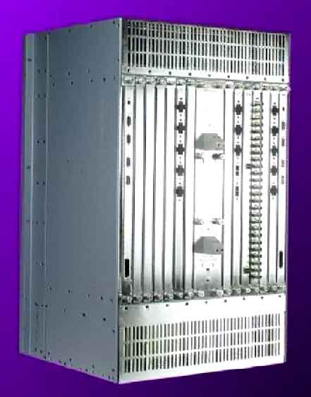 16-slot mid-plane chassis; front-loading Service, Trunk, Switch Fabrics, Network Timing and System Controller Modules; rear-loading Physical Interface Cards |